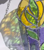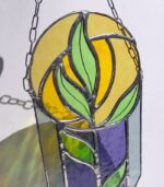 Inspired by the cycle of growth and renewal in nature, this handcrafted stained glass design features delicate green leaves and warm tones that reflect the essence of the sun. The unique harmony of purple and yellow adds artistic depth to the piece, creating a stunning visual display when touched by light. An ideal choice to bring the energy and serenity of nature into your living spaces!
